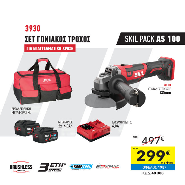 Στιβαρός γωνιακός τροχός μπαταρίας χωρίς ψήκτρες Το SKIL 3930 «20V Max» (18 V) είναι ένας ισχυρός γωνιακός τροχός μπαταρίας συμβατός με δίσκους 125 mm. Ο κινητήρας χωρίς ψήκτρες είναι γρηγορότερος, ισχυρότερος και έχει το λιγότερο 10 φορές μεγαλύτερη διάρκεια ζωής από έναν συγκρίσιμο κινητήρα με ψήκτρες.
